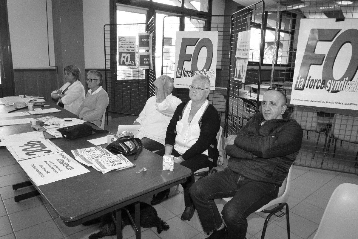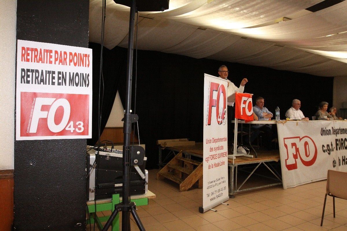« Non au régime universel de retraites par points », « Défense de tous les régimes de retraites », « retraites par points, retraite en moins » pouvait on lire sur les banderoles et affiches qui ornaient la salle du Conseil Départemental annuel des syndicats FORCE OUVRIERE ce vendredi 19 octobre à Blavozy.